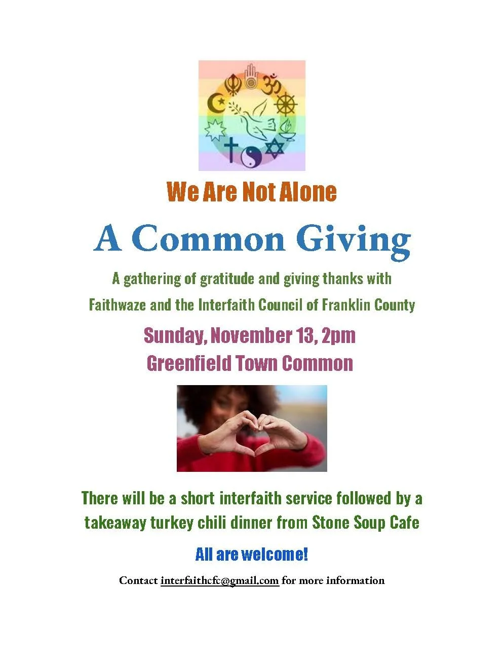 A Common Giving Sunday, November 13, 2022 2:00 PM 4:00 PM Interfaith Council of Franklin County (map) Google Calendar ICS Please join Faithwaze and the Interfaith Council on Sunday, November 13, at 2pm on Greenfield Common as we celebrate A Common Giving with a brief interfaith service and a takeaway turkey chili dinner supplied by Stone Soup Cafe.